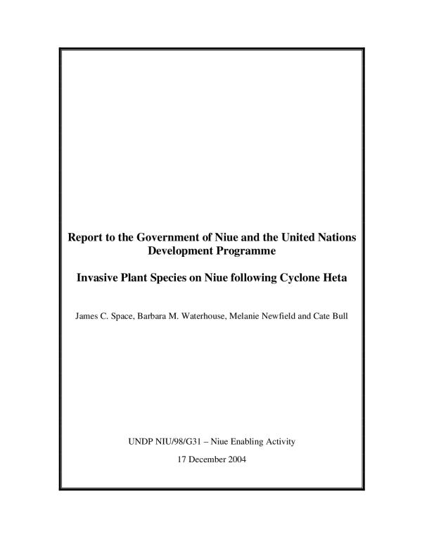 On January 6, 2004, the full force of Cyclone Heta, a category 5 cyclone, hit the island of Niue. In addition to the loss of life and property, serious damage was done to the forests and other ecosystems of the island, particularly on the north and west sides. If not blown over, most trees and other large vegetation were stripped of leaves and branches and subjected to salt spray. This sort of disturbance provides an opportunity for new invasive species to become established and for many species already present to flourish. Following the cyclone, personnel from the Cook Islands, Fiji, French Polynesia, New Zealand and other countries visited the island to provide aid and assistance, and equipment and material were brought in to aid m the recovery. Although quarantine procedures were maintained there is always the possibility of inadvertently introducing new plant species during an emergency such as this. During the cleanup process nibble was moved and dumped in new areas, transferring invasive species to new locations.
