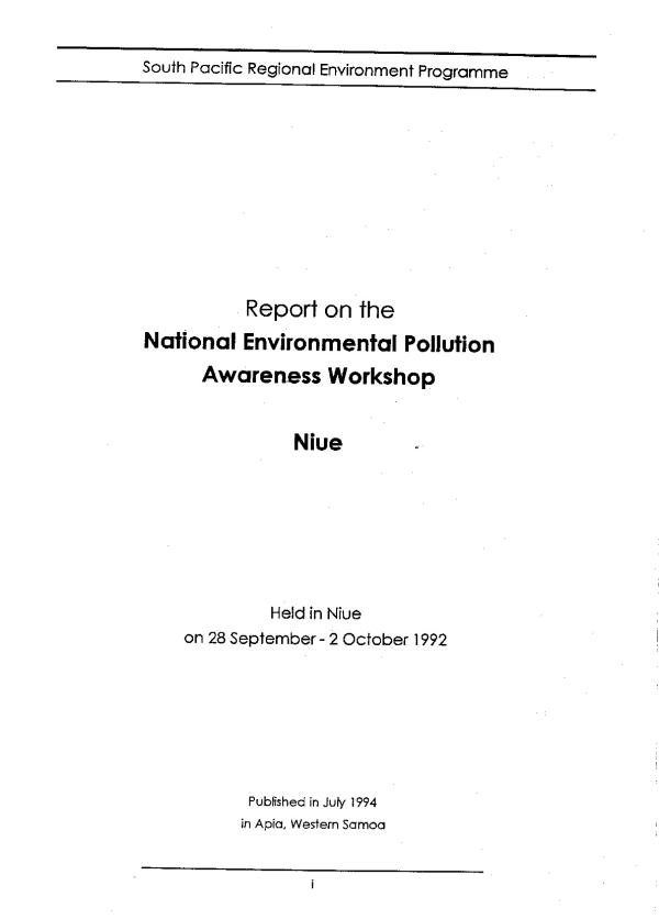 As part of the environmental awareness raising process associated with production of a National Environmental Strategy (NEMS) for Niue, a Pollution Awareness Workshop was convened from 28 September to 2 October, 1992. This workshop was organised by the South Pacific Regional Environment Progamme (SPREP) and the Deparatment of Community Affairs, Government of Niue. The workshop agenda is attached as Annex 1.