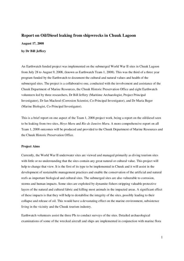 This is a brief report on one aspect of the Team 1, 2008 project work, being a report on the oil/diesel seen to be leaking from two sites, Hoyo Maru and Rio de Janeiro Maru. A more comprehensive report on all Team 1, 2008 outcomes will be produced and provided to the Chuuk Department of Marine Resources and the Chuuk Historic Preservation Office.