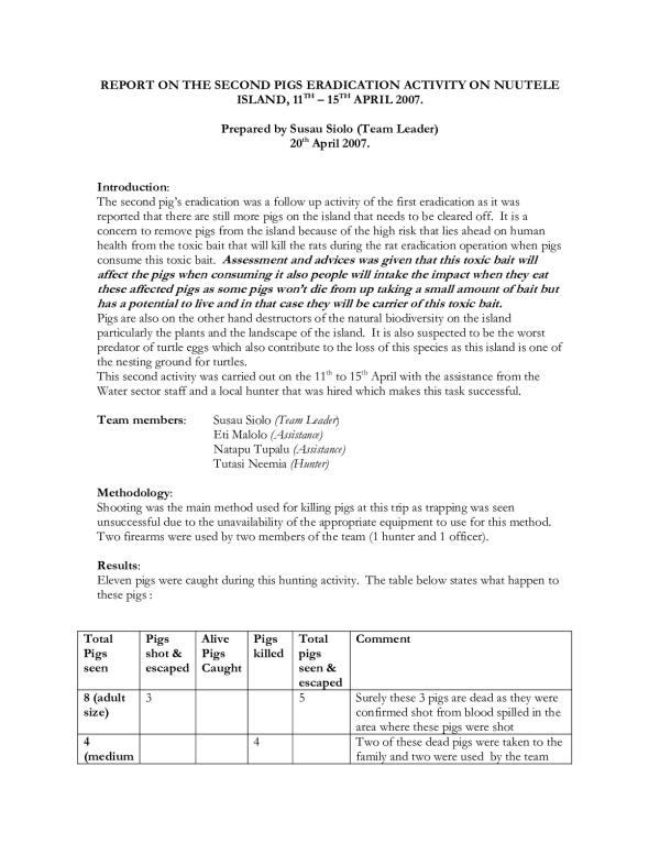 The second pigs eradication was a follow up activity of the first eradication as it was reported that there are still more pigs on the island that needs to be cleared off. It is a concern to remove pigs from the island because of the high risk that lies ahead on human health from the toxic bait that will kill the rats during the rat eradication operation when pigs consume this toxic bait. Assessment and advices was given that this toxic bait will affect the pigs when consuming it also people will intake the impact when they eat these affected pigs as some pigs wont die from up taking a small amount of bait but has a potential to live and in that case they will be carrier of this toxic bait. Pigs are also on the other hand destructors of the natural biodiversity on the island particularly the plants and the landscape of the island. It is also suspected to be the worst predator of turtle eggs which also contribute to the loss of this species as this island is one of the nesting ground for turtles. This second activity was carried out on the 11th to 15th April with the assistance from the Water sector staff and a local hunter that was hired which makes this task successful. Record Created: 15-Apr-2009