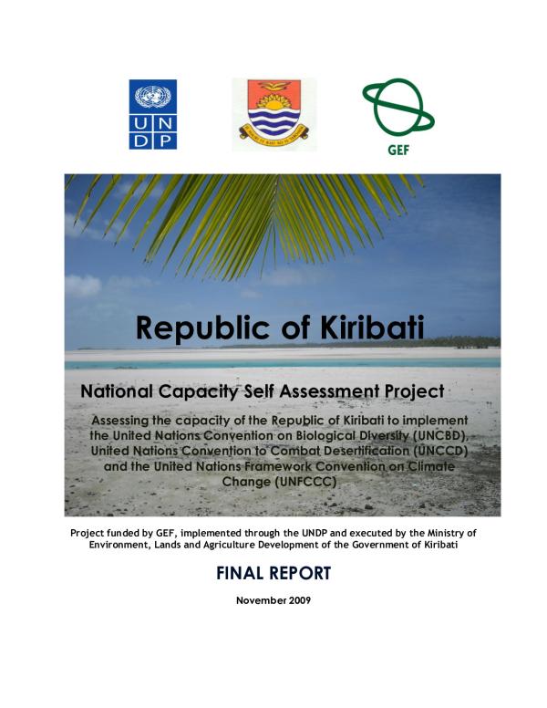 This final report of the Kiribati National Capacity Self Assessment (NCSA) Project presents an overview of the self-assessment approach taken, the main findings of the stock-take and thematic assessments, the cross-cutting assessment findings and a strategy for developing capacity to address needs and gaps identified during the assessments. The report is part of a series of reports produced under the Kiribati National Capacity Self Assessment (NCSA) Project funded by the GEF. The aim of the NCSA is for countries that are Parties to the UNCBD, UNCCD and UNFCCC, to assess their own capacities and capacity development needs to address the requirements of the three conventions. The report builds on previous three stock-take and thematic assessment reports targeting each of the three conventions and presents the findings of a national cross-cutting assessment exercise to identify environmental as well as capacity issues that cut across the three conventions and their thematic areas. The aim of the assessment is to; identify cross-cutting issues, identify opportunities for synergies and strengthening integrated and coordinated approach to environment management and sustainable development.