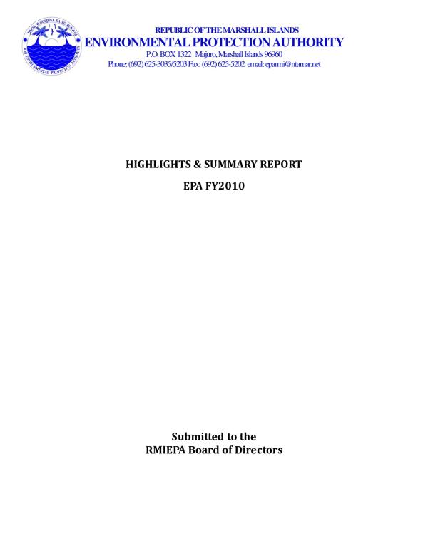 Environmental Protection Authority Renovation ProjectREPUBLIC OF THE MARSHALL ISLANDS ENVIRONMENTAL PROTECTION AUTHORITY P.O. BOX 1322 Majuro, Marshall Islands 96960 Phone: (692) 625-3035/5203 Fax: (692) 625-5202 email: eparmi@ntamar.net     HIGHLIGHTS & SUMMARY REPORT EPA FY2010                   Submitted to the RMIEPA Board of Directors  1.0 The Environmental Protection Authority This section provides information on the Role of the EPA, the current situation and policy focus. 1.1 Role of the Environmental Protection Authority The primary purpose of the Authority shall be to preserve and improve the quality of the environment The Act further states the objectives of the Authority: ⢠To study the impact of human activity including population growth and redistribution, cultural change, exploitation of resources and technological advances on the environment; ⢠To restore and maintain the quality of the environment; â¢