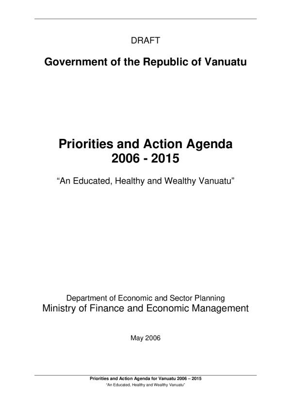 Government policy is to raise the welfare of the people of Vanuatu. Achieving this requires formal development planning. Vanuatu has been working on this since 1997 when the Comprehensive Reform Program was initiated. There was a summit in 2002 during which the Prime Minister announced five priorities. This was followed in 2003 by a Prioritised Action Agenda (PAA) which built upon these five priorities. This document is an update of the PAA, building on the experience of the past, taking account of what has been achieved and the challenges that remain.