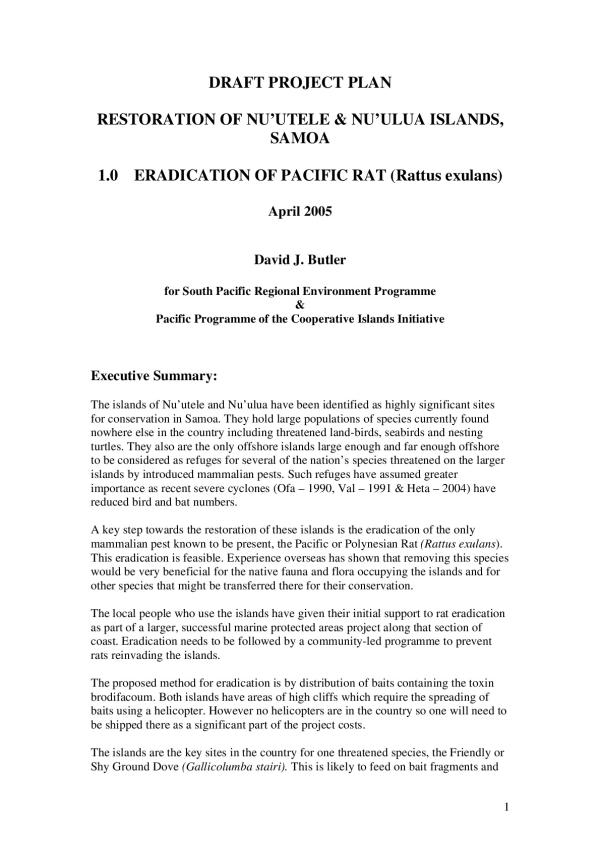 The islands of Nu'utele and Nu'ulua have been identified as highly significant sites for conservation in Samoa. They hold large populations of species currently found nowhere else in the country' including threatened land-birds, seabirds and nesting turtles. They also are the only offshore islands large enough and far enough offshore to be considered as refuges for several of the nation's species threatened on the larger islands by introduced mammalian pests. Such refuges have assumed greater importance as recent severe cyclones (Ofa - 1990, Val - 1991 & Heta - 2004) have reduced bird and bat numbers.