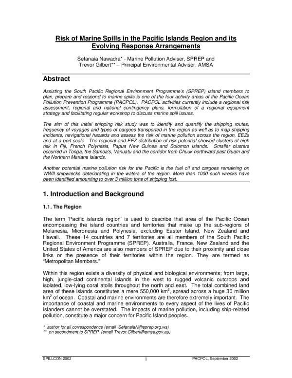 Assisting the South Pacific Regional Environment Programme's (SPREP) island members to plan, prepare and respond to marine spills is one of the four activity areas of the Pacific Ocean Pollution Prevention Programme (PACPOL). PACPOL activities currently include a regional risk assessment regional and national contingency plans, formulation of a regional equipment strategy and facilitating regular workshop to discuss marine spill issues. The aim of this initial shipping risk study was to identify and quantify the shipping routes, frequency of voyages and types of cargoes transported in the region as well as to map shipping incidents, navigational hazards and assess the risk of marine pollution across the region, EEZs and at a port scale. The regional and EEZ distribution of risk potential showed clusters of high risk in Fiji, French Polynesia, Papua New Guinea and Solomon Islands. Smaller clusters occurred in Tonga, the Samoa's, Vanuatu and the corridor from Chuuk northward past Guam and the Northern Mariana Islands. Another potential marine pollution risk for the Pacific is the fuel oil and cargoes remaining on WWII shipwrecks deteriorating in the waters of the region. More than 1000 such wrecks have been identified amounting to over 3 million tons of shipping lost.