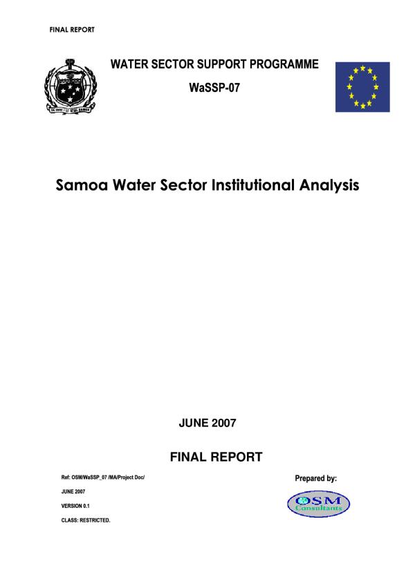 The review of the institutional arrangements that govern water resources management in Samoa provides a snapshot of the current challenges faced and recommendations and action points to address these challenges. To carry out the review, a five stage approach was adopted that consisted of (1) Literature Review, (2) Institutional Inventory and Key Stakeholder consultations, (3) Gap Analysis, (4) Recommendations and Action Points, (5) Workshop on Findings.