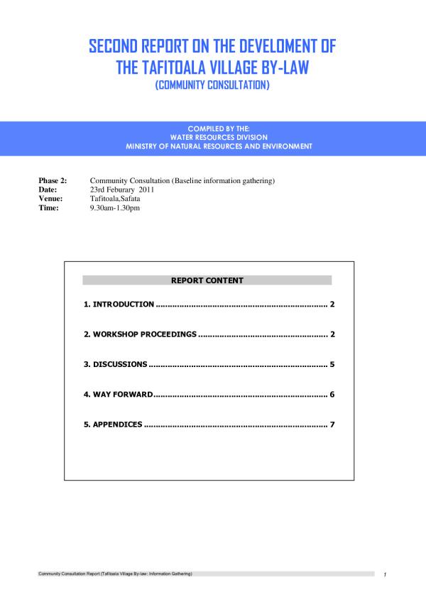 The village community expressed their support and agreed that village by-laws are necessary for Tafitoala. As expressed this will assist the village council of chiefs in managing resources and set up formal penalties for those who may/will breach the village laws. Following the initial planning workshop the MNRE (WRD) prepared a community consultation with the entire community, to undertake a situational analysis as well as gauge views of the village on what rules were necessary for the continuing sustainability of the resource. It was expected that the community consultation will provide all the baseline information of what problems were and how the village groups foresee by-laws as a means of protecting the resource from these problems.