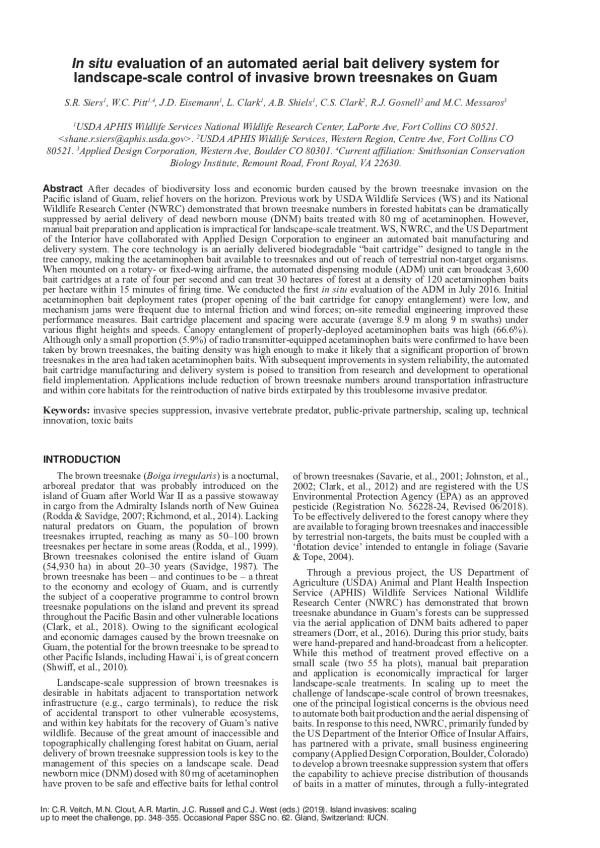After decades of biodiversity loss and economic burden caused by the brown treesnake invasion on the Pacific island of Guam, relief hovers on the horizon. Previous work by USDA Wildlife Services (WS) and its National Wildlife Research Center (NWRC) demonstrated that brown treesnake numbers in forested habitats can be dramatically suppressed by aerial delivery of dead newborn mouse (DNM) baits treated with 80 mg of acetaminophen. However, manual bait preparation and application is impractical for landscape-scale treatment. WS, NWRC, and the US Department of the Interior have collaborated with Applied Design Corporation to engineer an automated bait manufacturing and delivery system. The core technology is an aerially delivered biodegradable bait cartridge designed to tangle in the tree canopy, making the acetaminophen bait available to treesnakes and out of reach of terrestrial non-target organisms. When mounted on a rotary- or fixed-wing airframe, the automated dispensing module (ADM) unit can broadcast 3,600 bait cartridges at a rate of four per second and can treat 30 hectares of forest at a density of 120 acetaminophen baits per hectare within 15 minutes of fi ring time. We conducted the first in situ evaluation of the ADM in July 2016. Initial acetaminophen bait deployment rates (proper opening of the bait cartridge for canopy entanglement) were low, and mechanism jams were frequent due to internal friction and wind forces; on-site remedial engineering improved these performance measures. Bait cartridge placement and spacing were accurate (average 8.9 m along 9 m swaths) under various flight heights and speeds. Canopy entanglement of properly-deployed acetaminophen baits was high (66.6%). Although only a small proportion (5.9%) of radio transmitter-equipped acetaminophen baits were confirmed to have been taken by brown treesnakes, the baiting density was high enough to make it likely that a significant proportion of brown treesnakes in the area had taken acetaminophen baits. With subsequent improvements in system reliability, the automated bait cartridge manufacturing and delivery system is poised to transition from research and development to operational field implementation. Applications include reduction of brown treesnake numbers around transportation infrastructure and within core habitats for the reintroduction of native birds extirpated by this troublesome invasive predator.