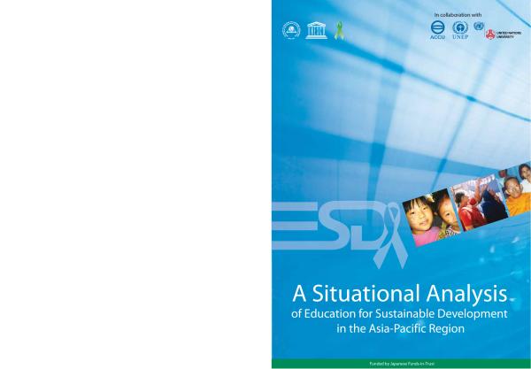 This Situational Analysis of Education for Sustainable Development (ESD) in the Asia-Pacific Region was commissioned by the UNESCO Asia and Pacific Regional Bureau for Education and financed by Japanese Funds-in-Trust. The Situational Analysis provides a snapshot of ESDs current state throughout Asia and the Pacific. The Analysis describes to what extent countries in the region have integrated ESD policies, programmes and practices into both formal and non-formal educational settings at the grassroots, sub-national and national levels. The knowledge gained from this Analysis has directly informed the development of the Working Paper: Asia-Pacific Regional Strategy for ESD. It will guide UNESCOs project implementation and future project formulation, and will also help to create and strengthen regional partnerships and networks for ESD.