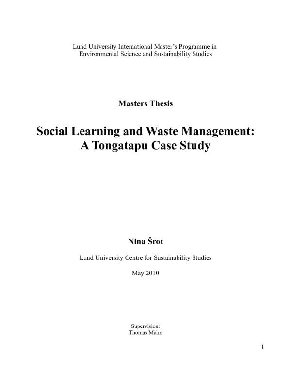 Lund University International Masterâs Programme in Environmental Science and Sustainability Studies Masters Thesis Social Learning and Waste Management: A Tongatapu Case Study Nina Å rot Lund University Centre for Sustainability Studies May 2010 Supervision: Thomas Malm 1Abstract In the debate on sustainability and humanity being faced with growing environmental concerns, many scholars are advocating for wider use of social learning models in order to successfully address complex challenges in a socially and ecologically sustainable way. The lively debate ranging from strong propositions for social learning approaches to relevant critiques of social learning encouraged this study. Waste management is one of the examples of complex challenges our societies need to deal with and that increasingly calls for a broader approach, rather than focusing on narrow technical solutions only. The study focuses on identifying limitations to social learning in waste management on Tongatapu, the m
