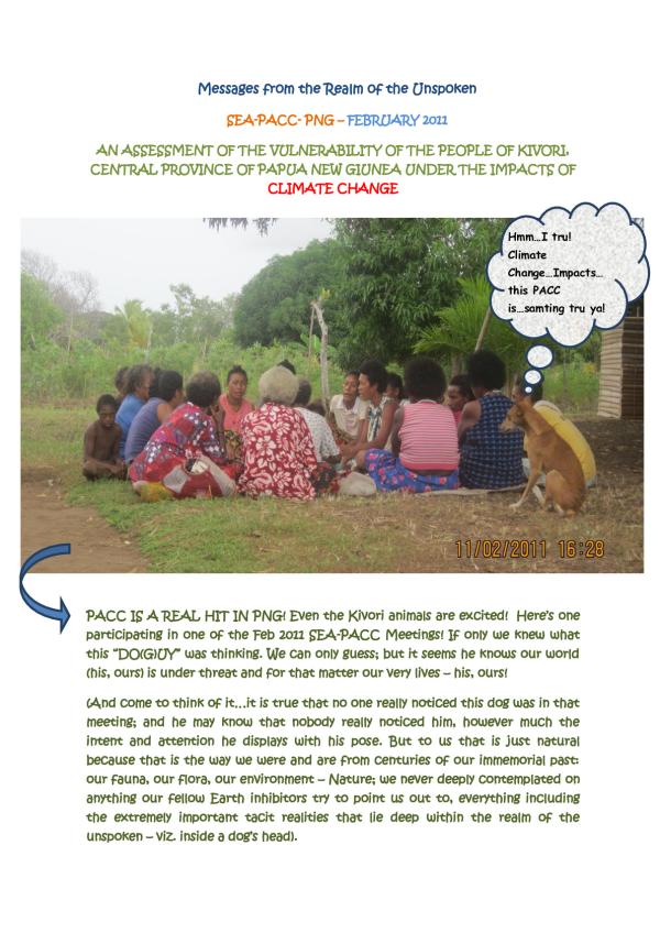 Messages from the Realm of the UnspokenMessages from the Realm of the Unspoken SEA-PACC- PNG â FEBRUARY 2011 AN ASSESSMENT OF THE VULNERABILITY OF THE PEOPLE OF KIVORI, CENTRAL PROVINCE OF PAPUA NEW GIUNEA UNDER THE IMPACTS OF CLIMATE CHANGE PACC IS A REAL HIT IN PNG! Even the Kivori animals are excited! Hereâs one participating in one of the Feb 2011 SEA-PACC Meetings! If only we knew what this âDO(G)UYâ was thinking. We can only guess; but it seems he knows our world (his, ours) is under threat and for that matter our very lives â his, ours! (And come to think of itâ¦it is true that no one really noticed this dog was in that meeting; and he may know that nobody really noticed him, however much the intent and attention he displays with his pose. But to us that is just natural because that is the way we were and are from centuries of our immemorial past: our fauna, our flora, our environment â Nature; we never deeply contemplated on anything our fellow Earth inhibitors try to