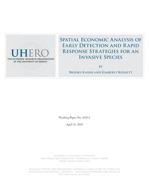 Economic impacts from invasive species, conveyed as expected damages to assets from invasion and expected costs of successful prevention and/or removal, may vary significantly across spatially differentiated landscapes. We develop a spatial-dynamic model for optimal early detection and rapid-response (EDRR) policies, commonly exploited in the management of potential invaders around the world, and apply it to the case of the Brown treesnake in Oahu, Hawaii. EDRR consists of search activities beyond the ports of entry, where search (and potentially removal) efforts are targeted toward areas where credible evidence suggests the presence of an invader. EDRR costs are a spatially dependent variable related to the ease or difficulty of searching an area, while damages are assumed to be a population dependent variable. A myopic strategy in which search only occurs when and where current expected net returns are positive is attractive to managers, and, we find, significantly lowers present value losses (by $270m over 30 years). We find further that in the tradeoff between search costs and damages avoided, early and aggressive measures that search some high priority areas beyond points of entry even when current costs of search exceed current damages can save the island more ($295m over 30 years). Extensive or non-targeted search is not advised however. Record Created: 08-Mar-2016