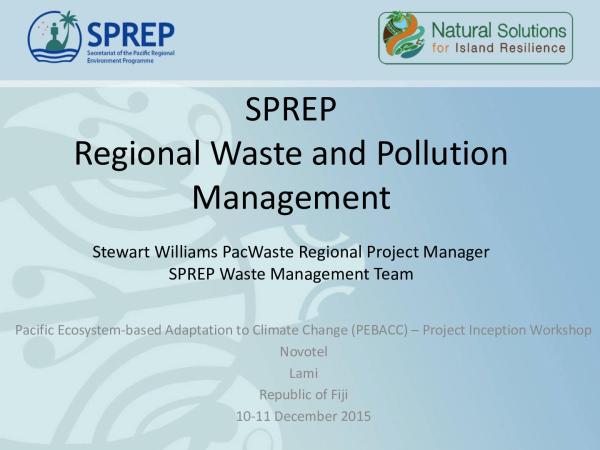 PowerPoint PresentationSPREP Regional Waste and Pollution Management Stewart Williams PacWaste Regional Project Manager SPREP Waste Management Team Pacific Ecosystem-based Adaptation to Climate Change (PEBACC) â Project Inception Workshop Novotel Lami Republic of Fiji 10-11 December 2015 Presentation Aims ⢠Introduce the SPREP Waste Management Division ⢠Summarize key waste management priorities and projects in the Pacific region ⢠Identify potential areas of collaboration between waste management and PEBACC SPREP Structure Climate Change Adaptation Mitigation Science & Policy Biodiversity & Ecosystems Coastal & Marine Threatened Species Invasive Species Biodiversity Environmental Monitoring Monitoring Governance Planning Waste & Pollution Marine and Land Pollution Hazardous Waste Solid Waste Corporate Services Outreach Information & IT Finance HR Marine Pollution â¢Marine oil and waste management â¢Ships Waste Management