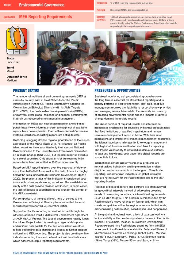 The number of multilateral environment agreements (MEAs) varies by country, with at least 20 MEAs for the Pacific islands region. Pacific leaders have adopted the Convention on Biological Diversity with its Aichi Targets (2011–2020), the Sustainable Development Goals (SDGs), and several other global, regional, and national commitments that rely on resourced environmental management.
