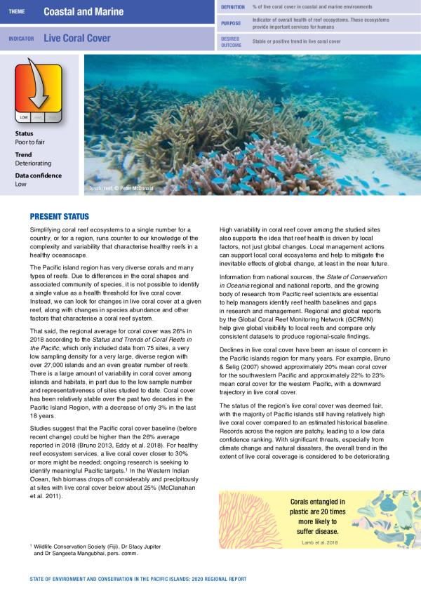 Simplifying coral reef ecosystems to a single number for a country, or for a region, runs counter to our knowledge of the complexity and variability that characterise healthy reefs in a healthy ocean scape. The Pacific island region has very diverse corals and many types of reefs. Due to differences in the coral shapes and associated community of species, it is not possible to identify a single value as a health threshold for live coral cover. Instead, we can look for changes in live coral cover at a given reef, along with changes in species abundance and other factors that characterise a coral reef system.