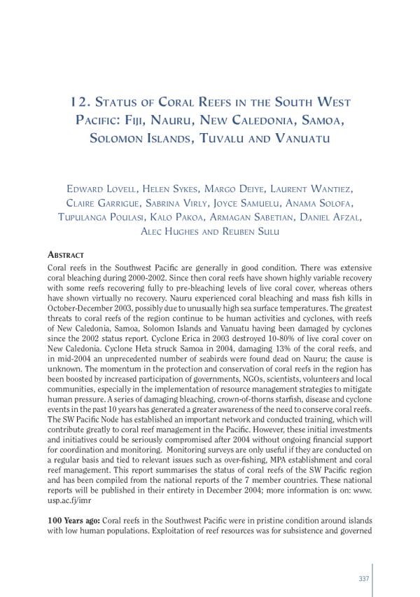 Coral reefs in the Southwest Pacific are generally in good condition. There was extensive coral bleaching during 2000-2002. Since then coral reefs have shown highly variable recovery with some reefs recovering fully to pre-bleaching levels of live coral cover, whereas others have shown virtually no recovery. Nauru experienced coral bleaching and mass fish kills in October-December 2003, possibly due to unusually high sea surface temperatures. The greatest threats to coral reefs of the region continue to be human activities and cyclones, with reefs of New Caledonia, Samoa, Solomon Islands and Vanuatu having been damaged by cyclones since the 2002 status report. Cyclone Erica in 2003 destroyed 10-80% of live coral cover on New Caledonia. Cyclone Heta struck Samoa in 2004, damaging 13% of the coral reefs, and in mid-2004 an unprecedented number of seabirds were found dead on Nauru; the cause is unknown. The momentum in the protection and conservation of coral reefs in the region has been boosted by increased participation of governments, NGOs, scientists, volunteers and local communities, especially in the implementation of resource management strategies to mitigate human pressure. A series of damaging bleaching, crown-of-thorns starfish, disease and cyclone events in the past 10 years has generated a greater awareness of the need to conserve coral reefs. The SW Pacific Node has established an important network and conducted training, which will contribute greatly to coral reef management in the Pacific. However, these initial investments and initiatives could be seriously compromised after 2004 without ongoing financial support for coordination and monitoring. Monitoring surveys are only useful if they are conducted on a regular basis and tied to relevant issues such as over-fishing, MPA establishment and coral reef management. This report summarises the status of coral reefs of the SW Pacific region and has been compiled from the national reports of the 7 member countries.