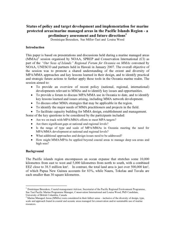 This paper is based on presentations and discussions held during a marine managed areas (MMAs)2 session organised by NOAA, SPREP and Conservation International (CI) as part of the Our Seas of Islands Regional Forum for Oceania on MMAs convened by NOAA, UNESCO and partners held in Hawaii in January 2007. The overall objective of the session was to promote a shared understanding of the extent and diversity of MPA/MMA approaches and key lessons learned in their design, and to identify practical and strategic future actions to further apply these tools in the Oceania marine realm.