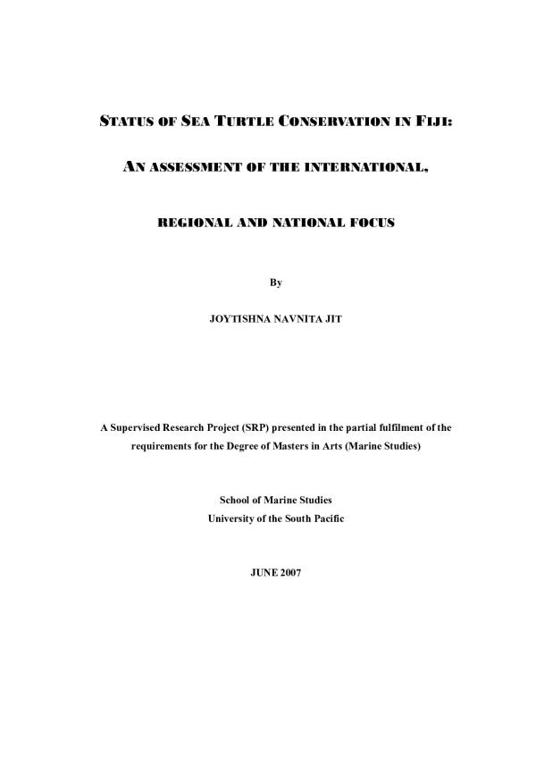 Sea turtles will become extinct unless appropriate action is taken to reverse the decline. This study assesses the existing framework and mechanisms for sea turtle conservation at the international, regional and national levels. The study is a combination of literature and legislative review, a case study of a traditional sea turtle fishing community, and interviews with key contacts. Local perspective 011 sea turtle conservation 111 regard to culture, traditional knowledge, and socio-economic considerations is addressed to provide insight into the stams of turtle conservation 111 the country.