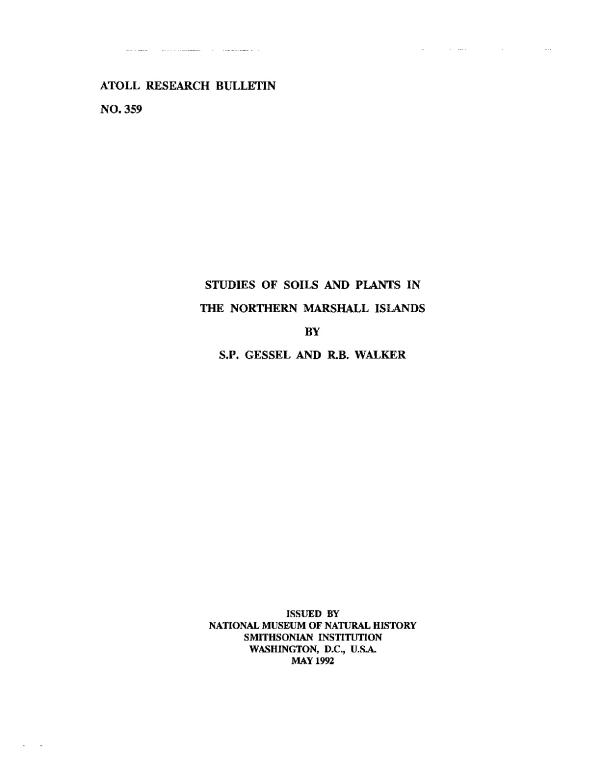 During the period 1958-1964, the authors undertook soil and vegetation studies in the northern Marshall Islands as part of the University of Washington Radiation Biology Laboratory surveillance team. This team was responsible for monitoring levels of radiation in various components of the island environment and any effects on plant and animal life. The authors of this report were charged with the soils and vegetation components but assisted with collections in the aquatic ecosystems and some food plant materials. Collections and measurements were made during relatively short term visits to the islands with sample processing and analysis performed during intervening periods. Much of the field and laboratory work was done by graduate students in the College of Forest Resources and the Department of Botany, with results reported in theses, but generally not in the open press. Therefore, we use some of this material in the report, together with unpublished material from our files.