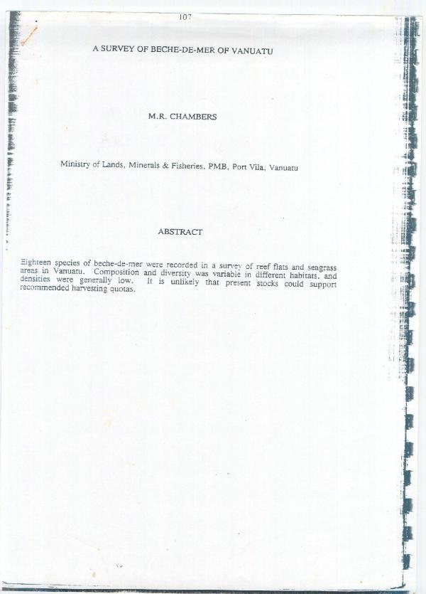 Eighteen Species of beche-de-mer were recored in a survey of eef flats and seagrass areas in Vanuatu.Composition and diversity was variable in different habitats, and denstities were genereally low.It is unlikely that present stocks could support recommended harvesting quotas.
