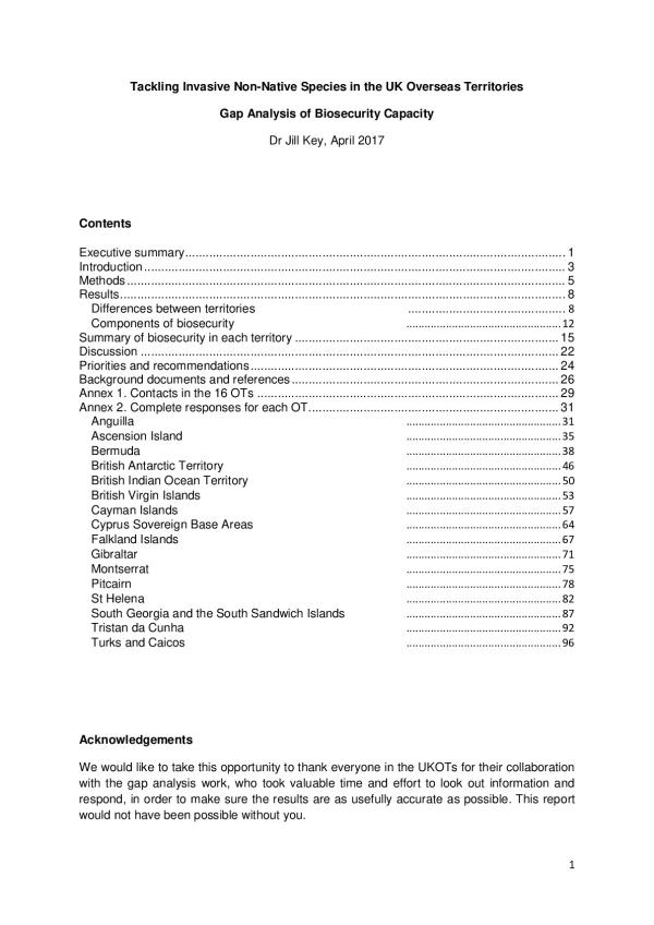 In 2016 the project Tackling Invasive Non-Native Species in the UK Overseas Territories was initiated, funded through the FCOs Conflict, Stability and Security Fund (CSSF). The project objective is to improve the biosecurity of the OTs against invasive non-native species to improve their environmental resilience and food security; achieved through reducing the risk and impact of invasion and natural hazards via technical assistance and capacity building. In order to plan the appropriate capacity building activities a gap analysis was carried out between January and March 2017 on biosecurity practices and capacity in all 16 UK OTs. Record Created: 29-Apr-2020