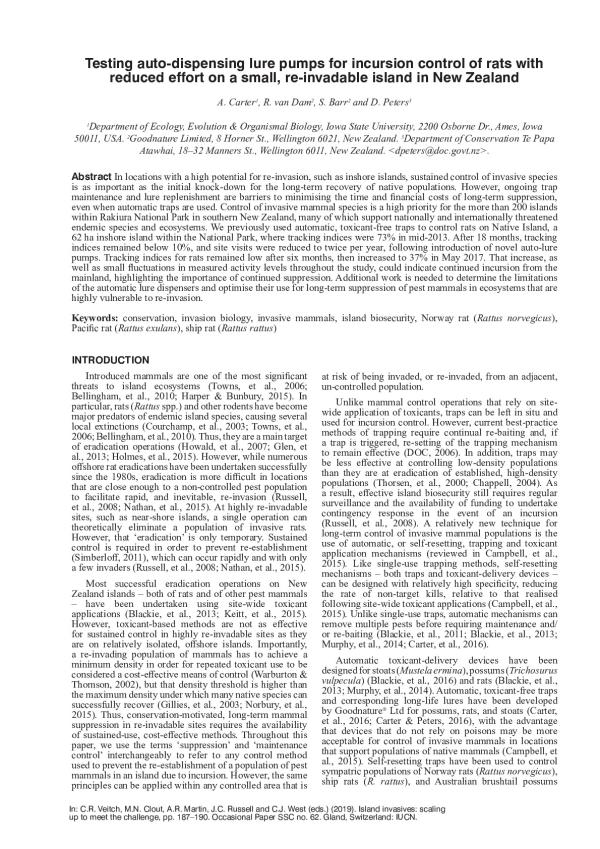 In locations with a high potential for re-invasion, such as inshore islands, sustained control of invasive species is as important as the initial knock-down for the long-term recovery of native populations. However, ongoing trap maintenance and lure replenishment are barriers to minimising the time and financial costs of long-term suppression, even when automatic traps are used. Control of invasive mammal species is a high priority for the more than 200 islands within Rakiura National Park in southern New Zealand, many of which support nationally and internationally threatened endemic species and ecosystems. We previously used automatic, toxicant-free traps to control rats on Native Island, a 62 ha inshore island within the National Park, where tracking indices were 73% in mid-2013. After 18 months, tracking indices remained below 10%, and site visits were reduced to twice per year, following introduction of novel auto-lure pumps. Tracking indices for rats remained low after six months, then increased to 37% in May 2017. That increase, as well as small fluctuations in measured activity levels throughout the study, could indicate continued incursion from the mainland, highlighting the importance of continued suppression. Additional work is needed to determine the limitations of the automatic lure dispensers and optimise their use for long-term suppression of pest mammals in ecosystems that are highly vulnerable to re-invasion.