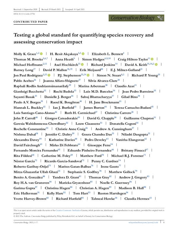 This emphasizes that species recovery is conceptually different from extinction risk and reinforces the utility of the IUCN Green Status of Species to more fully understand species conservation status. Although extinction risk did not predict conservation legacy, conservation dependence, or conservation gain, it was positively correlated with recovery potential. Only 1.7% of tested species were categorized as zero across all 4 of these conservation impact metrics, indicating that conservation has, or will, play a role in improving or maintaining species status for the vast majority of these species. Based on our results, we devised an updated assessment framework that introduces the option of using a dynamic baseline to assess future impacts of conservation over the short term to avoid misleading results which were generated in a small number of cases, and redefines short term as 10 years to better align with conservation planning. These changes are reflected in the IUCN Green Status of Species Standard.