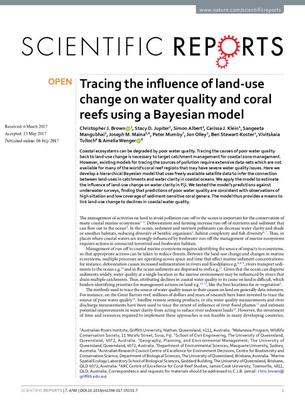 Coastal ecosystems can be degraded by poor water quality. Tracing the causes of poor water quality back to land-use change is necessary to target catchment management for coastal zone management. However, existing models for tracing the sources of pollution require extensive data-sets which are not available for many of the worlds coral reef regions that may have severe water quality issues. Here we develop a hierarchical Bayesian model that uses freely available satellite data to infer the connection between land-uses in catchments and water clarity in coastal oceans. We apply the model to estimate the influence of land-use change on water clarity in Fiji. We tested the models predictions against underwater surveys, finding that predictions of poor water quality are consistent with observations of high siltation and low coverage of sediment-sensitive coral genera. The model thus provides a means to link land-use change to declines in coastal water quality