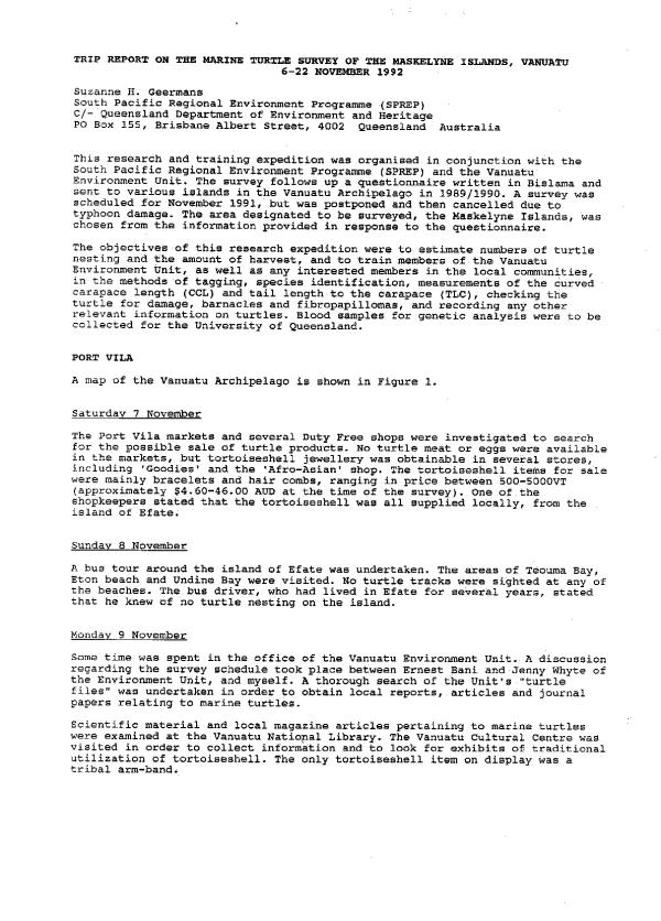 This research and training expedition was organised in conjunction with the South Pacific Regional Environment Programme (SPREP) and the Vanuatu Environment Unit. The survey follows up a questionnaire written in Bislama and sent to various islands in the Vanuatu Archipelago in 1989/1990. A survey was scheduled for November 1991, but was postponed and then cancelled due to typhoon damage. The area designated to be surveyed, the Maskelyne Islands, was chosen from the information provided in response to the questionnaire. The objectives of this research expedition were to estimate numbers of turtle nesting and the amount of harvest, and to train members of the Vanuatu Environment Unit, as well as any interested members in the local communities, in the methods of tagging, species identification, measurements of the curved carapace length (CCL) and tail length to the carapace (TLC), checking the turtle for damage, barnacles and fibropapillomas, and recording any other relevant information on turtles. Blood samples for genetic analysis were to be collected for the University of Queensland.