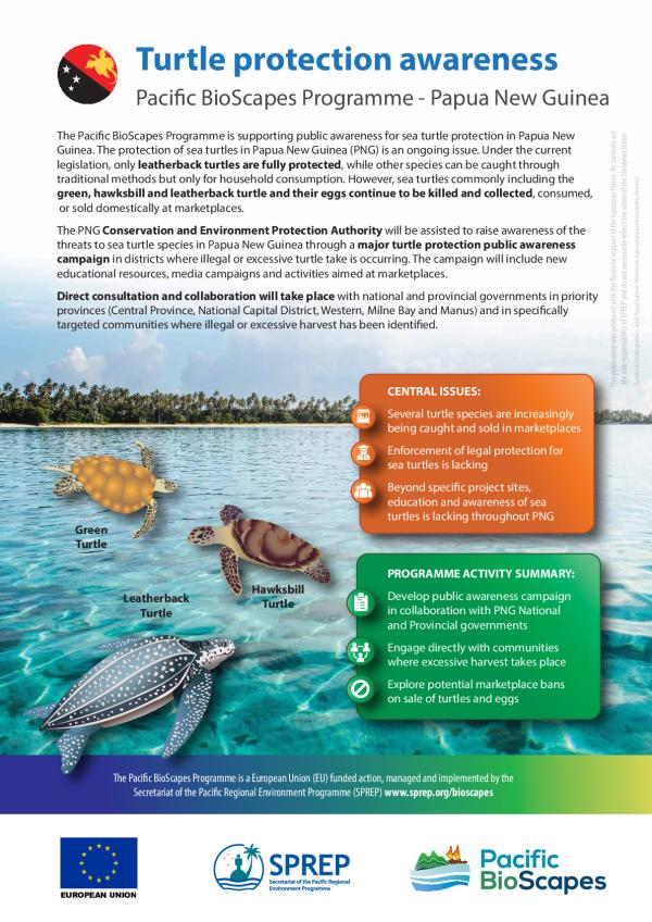 The Pacific BioScapes Programme is supporting public awareness for sea turtle protection in Papua New Guinea. The protection of sea turtles in Papua New Guinea (PNG) is an ongoing issue. The PNG Conservation and Environment Protection Authority will be assisted to raise awareness of the threats to sea turtle species in Papua New Guinea through a major turtle protection public awareness campaign.