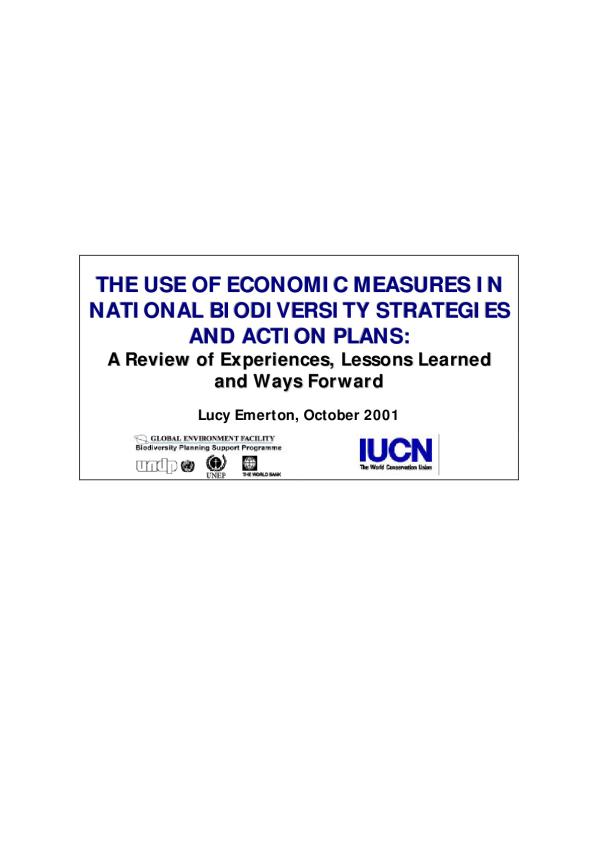 This document reports on a project reviewing the use of economic measures in National Biodiversity Strategies and Action Plans, carried out by IUCN - The World Conservation Union between September 2000 and September 2001. This project was funded by the GEF as part of the Biodiversity Planning Support Programme (BPSP), with co-finance provided by the Swiss Agency for Development and Co-operation (SDC) under the project Supporting Global Action to Conserve Biodiversity and Sustainable Use Biological Resources: Phase III