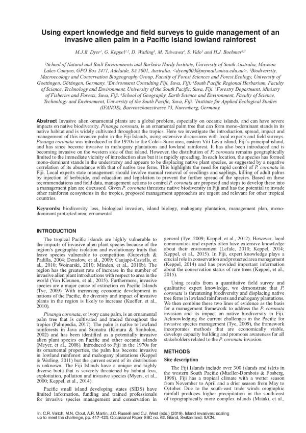 Invasive alien ornamental plants are a global problem, especially on oceanic islands, and can have severe impacts on native biodiversity. Pinanga coronata, is an ornamental palm tree that can form mono-dominant stands in its native habitat and is widely cultivated throughout the tropics. Here we investigate the introduction, spread, impact and management of this invasive palm in the Fiji Islands, using extensive discussions with local experts and ?eld surveys. Pinanga coronata was introduced in the 1970s to the Colo-i-Suva area, eastern Viti Levu island, Fiji´s principal island, and has since become invasive in mahogany plantations and lowland rainforest. It has also been introduced and is becoming invasive on the western side of that island. However, the distribution of P. coronata remains geographically limited to the immediate vicinity of introduction sites but it is rapidly spreading. In each location, the species has formed mono-dominant stands in the understorey and appears to be displacing native plant species, as suggested by a negative correlation of its abundance with that of native tree ferns. This highlights the need for rapid control of P. coronata in Fiji. Local experts state management should involve manual removal of seedlings and saplings, killing of adult palms by injection of herbicide, and education and legislation to prevent the further spread of the species. Based on these recommendations and ?eld data, management actions to control P. coronata are proposed and steps to develop these into a management plan are discussed. Given P. coronata threatens native biodiversity in Fiji and has the potential to invade other rainforest ecosystems in the tropics, proposed management approaches are urgent and relevant for other tropical countries.
