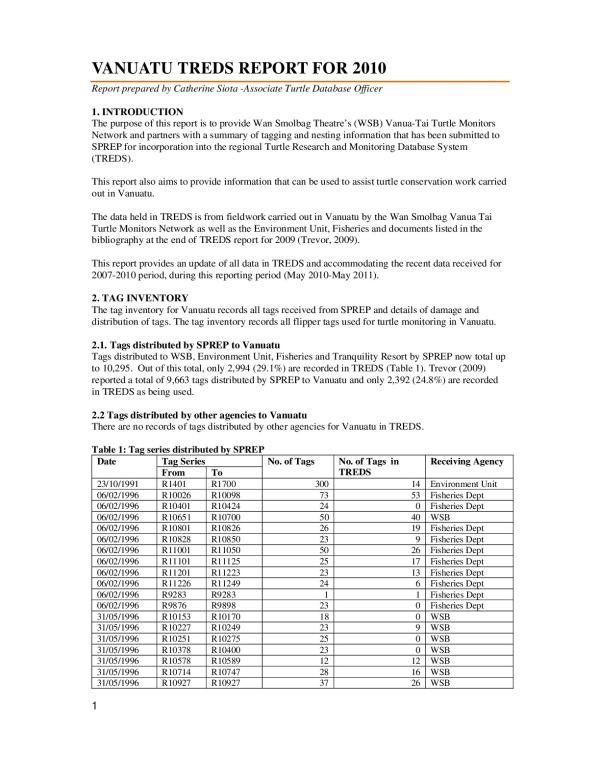 The purpose of this report is to provide Wan Smolbag Theatre's (WSB) Vanua-Tai Turtle monitors network and partners with a summary of tagging and nesting information that has been submitted to SPREP for incorporation into the regional turtle research and monitoring database system (TREDS)