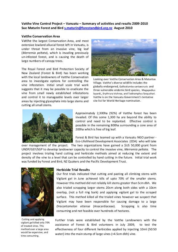 Looking over Vatthe Conservation Area & Matantas Village. Vattheâs diverse wildlife includes the globally endangered, Gallicolumba santaecrusis and three vulnerable endemic bird species, Megapodius layardi,, Erythrura trichroa, and Todiramphus farquahari. Vatthe is on the Vanuatu Governmentâs tentative site list for World Heritage nomination. Vatthe Vine Control Project â Vanuatu â Summary of activities and results 2009-2010 Sue Maturin Forest and Bird s.maturin@forestandbird.org.nz August 2010 Vatthe Conservation Area Vatthe the largest Conservation Area, and most extensive lowland alluvial forest left in Vanuatu, is under threat from an invasive vine, big leaf (Merremia peltata), which is invading previously un-infested forest, and is causing the death of large numbers of canopy trees. The Royal Forest and Bird Protection Society of New Zealand (Forest & Bird) has been working with the local landowners of Vatthe Conservation area to investigate options for controlling th