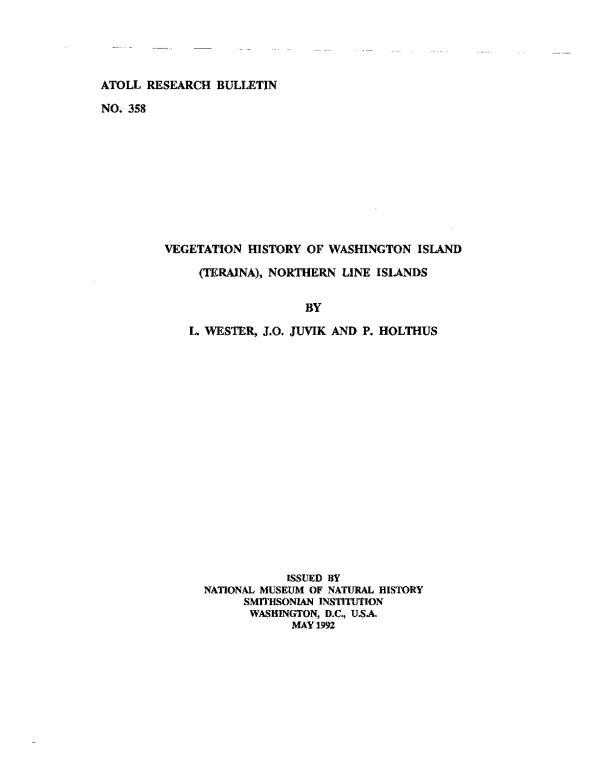 Washington Island (Teraina) in the Northern Line Islands is a small atoll with a land area of 14.2 sq. km. situated at 4° 4 3'N, 160° 25'W. The Northern Line Island archipelago is comprised of four islands alined on an axis which runs from Christmas Island, just north of the equator, to Palmyra Island in the northwest (Figure 1). Washington Island, and its nearest neighbor Fanning Island, about 150 kilometers to the south east, have had close economic and social ties for most of their recent history. The climate of Washington Island is strongly influenced by intertropical convergence and has an average annual rainfall of 2902 mm although Christmas Island, two degrees south, receives only 766 mm.