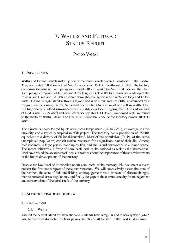 Wallis and Futuna Islands make up one of the three French overseas territories in the Pacific. They are located 2000 km north of New Caledonia and 3500 km northwest of Tahiti. The territory comprises two distinct archipelagoes situated 240 km apart: the Wallis Islands and the Horn Archipelago composed of Futuna and Alofi. The Wallis Islands are made up of the main island Uvea and 19 islets scattered throughout a lagoon which is 24 km long and 15 km wide. Futuna is high island without a lagoon and with a few areas of cliffs, surrounded by a fringing reef of varying width. Separated from Futuna by a channel of 1800 m width, Alofi is a high volcanic island surrounded by a variably developed fringing reef. The surface area of land is small (215 km2) and coral reefs occupy about 300 km2 ; immerged reefs are found to the north of Wallis Island. The Exclusive Economic Zone of the territory covers 300,000 km2.