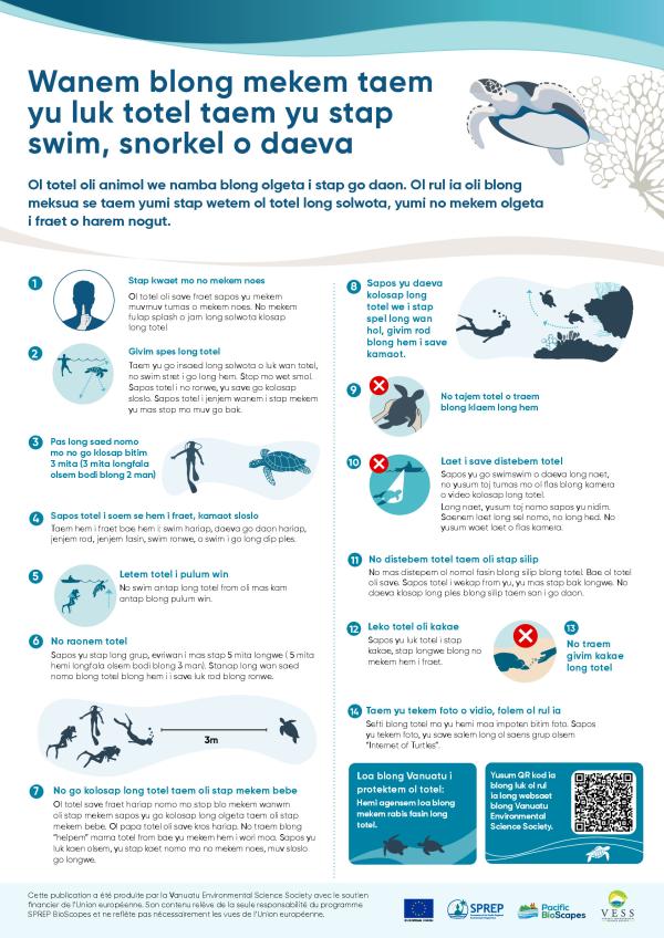 Ol totel oli animol we namba blong olgeta i stap go daon. Ol rul ia oli blong meksua se taem yumi stap wetem ol totel long solwota, yumi no mekem olgeta i fraet o harem nogut.