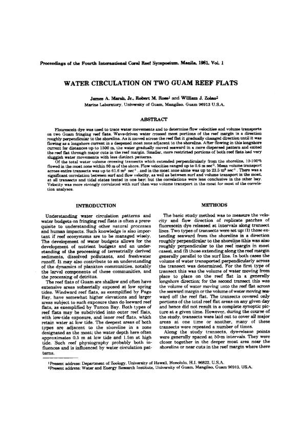 Flourescein dye was used to trace water movements and to determine flow velocities and volume transports on two Guam fringing reef flats. Wave-driven water crossed most portions of the reef margin in a direction roughly perpendicular to the shoreline. As it moved across the reef flat it gradually changed direction until it was flowing as a longshore current in a deepened moat zone adjacent to the shoreline. After flowing in this longshore current for distances up to 1500 m, the water gradually moved seaward in a more dispersed pattern and exited the reef flat through major cuts in the reef margin. Smaller, more restricted portions of both reef flats had very sluggish water movements with less distinct patterns. Of the total water volume crossing transects which extended perpendicularly from the shoreline, 10-100% flowed in the moat zone within 80 m of the shore. Flow velocities ranged up to 0.6 m sec1. Mean volume transport across entire transects was up to 61.6 m3 sec1. and in the moat zone alone was up to 23.5 m3 sec-1. There was a significant correlation between surf and flow velocity, as well as between surf and volume transport in the moat, at all transects and tidal states tested in one bay; but the correlations were less conclusive in the other bay. Velocity was more strongly correlated with surf than was volume transport in the moat for most of the correlation analyses.