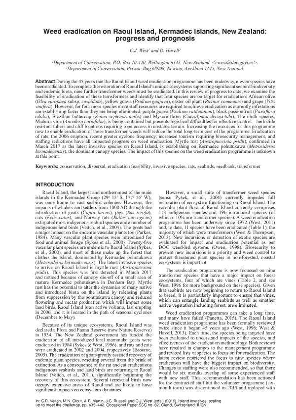 During the 45 years that the Raoul Island weed eradication programme has been underway, eleven species have been eradicated. To complete the restoration of Raoul Islands unique ecosystems supporting signi?cant seabird biodiversity and endemic biota, nine further transformer weeds must be eradicated. In this review of progress to date, we examine the feasibility of eradication of these transformers and identify that four species are on target for eradication: African olive (Olea europaea subsp. cuspidata), yellow guava (Psidium guajava), castor oil plant (Ricinus communis) and grape (Vitis vinifera). However, for four more species more sta? resources are required to achieve eradication as currently infestations are establishing faster than they are being eliminated: purple guava (Psidium cattleianum), black passionfruit (Passi?ora edulis), Brazilian buttercup (Senna septemtrionalis) and Mysore thorn (Caesalpinia decapetala). The ninth species, Madeira vine (Anredera cordifolia), is being contained but presents logistical di?culties for e?ective control herbicide resistant tubers and cli? locations requiring rope access in unstable terrain. Increasing the resources for this programme now to enable eradication of these transformer weeds will reduce the total long-term cost of the programme. Eradication of rats, the 2006 eruption, recent greater cyclone frequency, increased tourism requiring biosecurity management, and sta?ng reductions have all impacted progress on weed eradication. Myrtle rust (Austropuccinia psidii), con?rmed in March 2017 as the latest invasive species on Raoul Island, is establishing on Kermadec pohutukawa (Metrosideros kermadecensis), the dominant canopy species. The impact of this species on the weed eradication programme is unknown at this point.