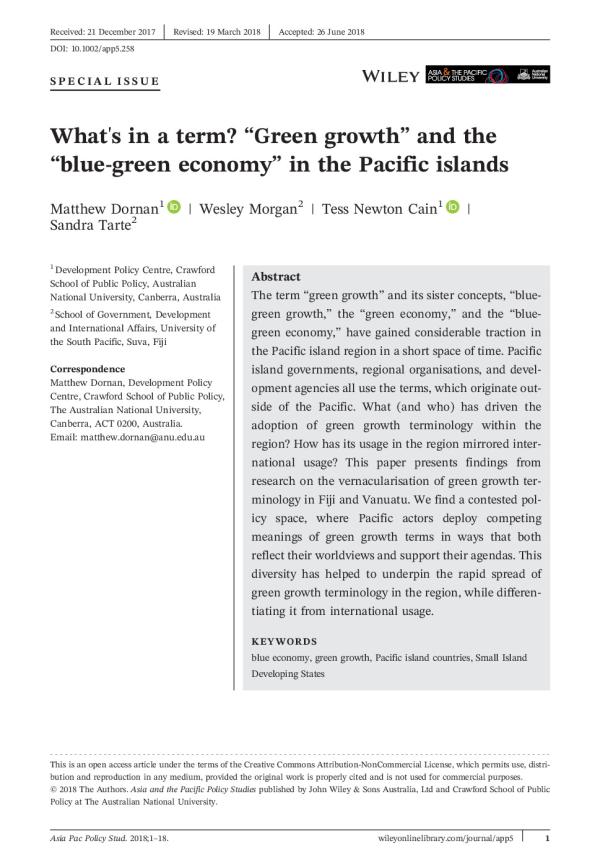 The termgreen growthand its sister concepts,blue-green growth,thegreen economy,and theblue-green economy,have gained considerable traction in the Pacific island region in a short space of time. Pacific island governments, regional organisations, and development- agencies all use the terms, which originate out-side of the Pacific.