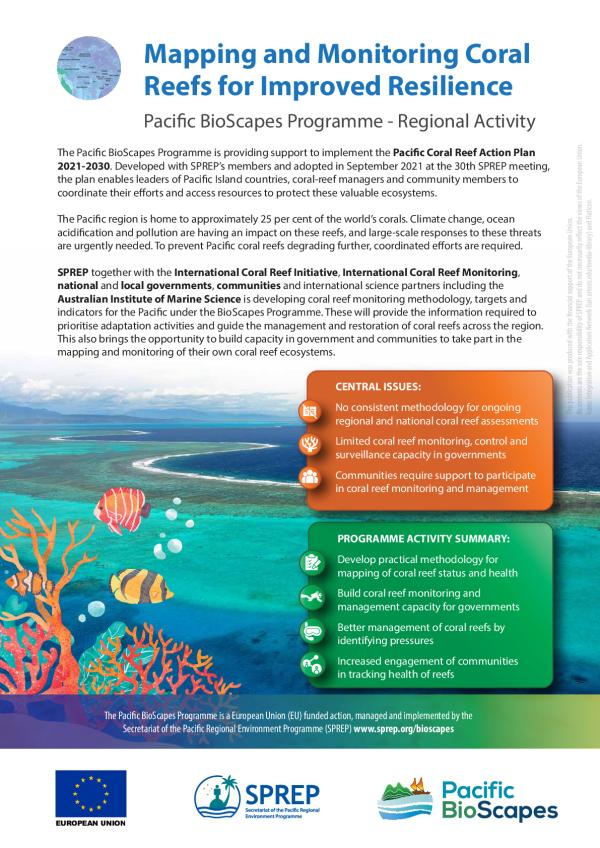 The Pacific BioScapes Programme is providing support to implement the Pacific Coral Reef Action Plan 2021-2030. Developed with SPREP’s members and adopted in September 2021 at the 30th SPREP meeting, the plan enables leaders of Pacific Island countries, coral-reef managers and community members to coordinate their efforts and access resources to protect these valuable ecosystems.