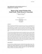 Members of the South Pacific Whale Research Consortium met at the University of Auckland from 8-12 February, 2009 to discuss (i) the results of fieldwork and analysis conducted during 2008 and, (ii) conservation initiatives in the region. As with previous synoptic surveys dating back to the austral winter of 1999, surveys of humpback whales were conducted to collect genetic samples, individual identification photographs and song recordings in the four primary regions: New Caledonia, Tonga (Vavau), Cook Islands and French Polynesia (Moorea). Other regions surveyed in 2008 included Samoa, American Samoa, Fiji, New Zealand, Niue, Norfolk Island, Hervey Bay, Peregian Beach and Eden. A total of 218 photo-identified individuals recorded from throughout the Oceania region during 2007 were matched against the quality-controlled Oceania region photo-ID catalogues from the years 1999- 2007. This revealed additional evidence of low levels of interchange among breeding grounds of Oceania. Following the genotype match reported between French Polynesia and Colombia (breeding stocks F and G) reported in the 2008 SPWRC report, a comparison of quality controlled flukes from French Polynesia and the Antarctic Peninsula was undertaken during 2008. This comparison did not produce any confirmed matches between the two regions. Song analysis for the years 2002-2006 showed a pattern of sequential movement of unique song types from eastern Australia, east across the breeding grounds of Oceania. Members once again expressed their opposition to Japan's continued lethal research programme in the Antarctic and their concern that the ongoing or planned hunt of fin and humpback whales could negatively impact small, recovering populations some of which are the subject of long-term, non-lethal research by the Consortium.