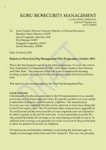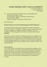 Progress report from Jack Craw to Josie Tamate (Directory General, Ministry of Natural Resources), Brendon Pasisi (Director DAFF), Sauni Tongatule (Director Department of Environment), David Moverly (SPREP) and Huggard Tongatule (Department of Environment).|This is the final progress report on the pilot programme. It covers the visit to Niue September 8 to September 18 2015, with master hunters Glen Osborne and Peter Peeti. The purposes of this trip were to continue the hunting training, progress the toxin trial and attempt to progress the lured enclosure trial.
