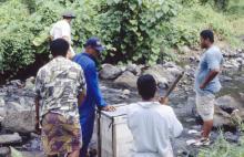 Unloading trial hives for Uafato Conservation Area, Samoa Dion Ale (CASO) in blue, Bill Moore (with the hat). May 1999